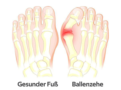 Ballenzehe ist eine knöcherne Beule, die sich am Gelenk an der Basis der Großzehe bildet. Das führt dazu, dass die Spitze der großen Zehe in Richtung der kleineren Zehen gezogen wird und das Gelenk an der Basis der großen Zehe hervorsteht.