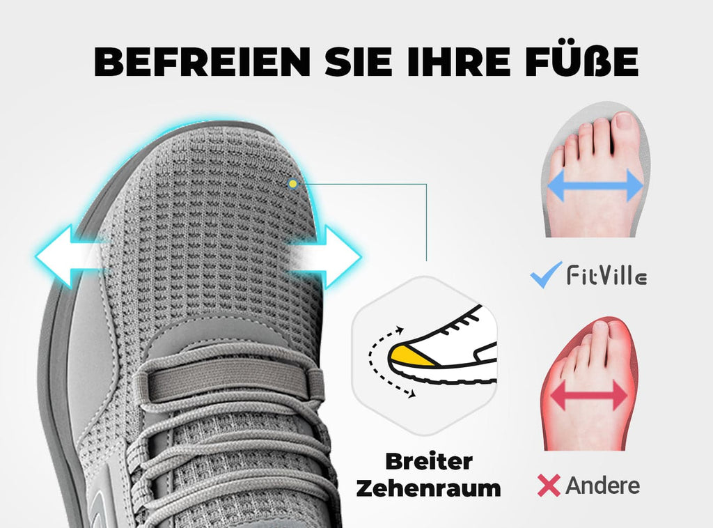 FitVille Fresh Core Laufschuh verfügt über eine breite und eine extrabreite Zehenbox, um ein Höchstmaß an Komfort für jene mit breiten oder durchschnittlichen Füßen zu bieten.