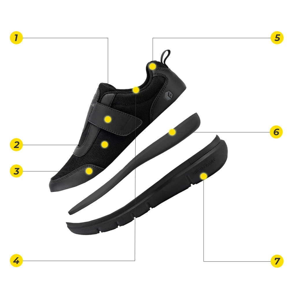 - Einfaches An- und Ausziehen: Die verstellbaren Riemen ermöglichen eine präzise Anpassung an hohe Spanne und geschwollene Füße.