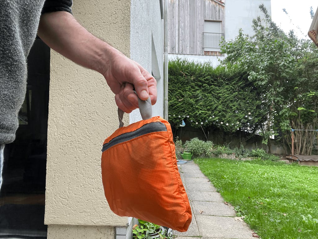 "Habe ich nicht einen Rucksack bestellt?" dachte ich, als dabei war, meine Bestellung auszupacken. Tatschlich: ein kleines, orangenes Päckchen war da drin! Dieses lässt sich zu einem vollwertigen Rucksack entfalten. Meine Fotos zeigen wie klein und Handlich der Rucksack in komprimierten Zustand ist— er verschwindet einfach unter meiner Kappe ;-) ...& und kann auch noch kleiner zusammengedruckt, gepresst, verstaut usw. werden.