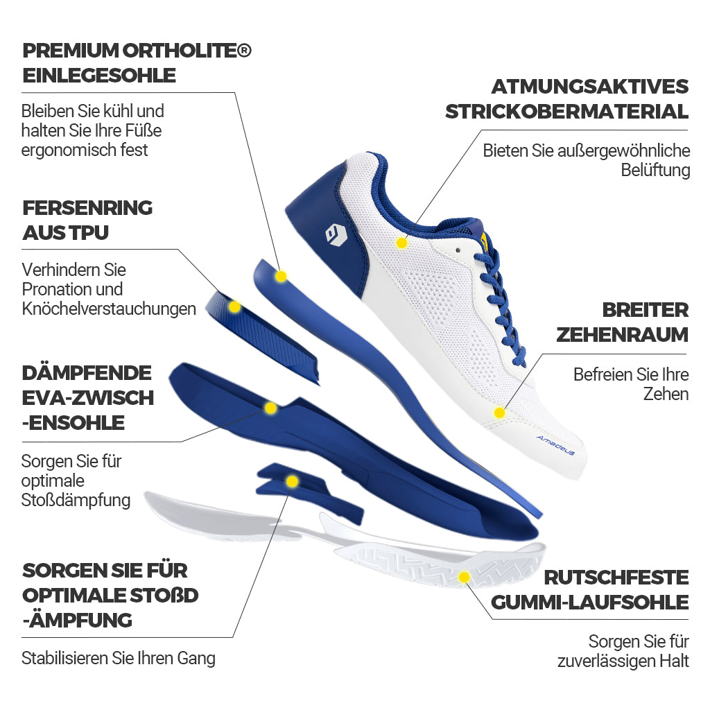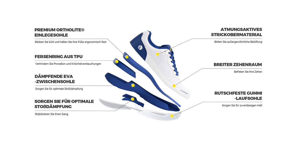 Bei intensiven Spielen sorgt das dehnbare Strickobermaterial dafür, dass Ihre Füße belüftet werden und eine Überhitzung verhindert wird. Darüber hinaus bieten diese Schuhe mit einem stabilisierenden TPU-Fersenring und Mittelfuß-TorsionGrip eine effiziente Gang- und Anti-Pronationsunterstützung. Und für Stabilität und Halt auf dem Platz sorgt die Gummisohle mit Profilmuster dafür, dass Sie bei den entscheidenden Spielzügen nicht ausrutschen. Steigern Sie Ihre Leistung und Ihren Komfort mit den FitVille Amadeus Tennis- und Pickleball-Platzschuhen V2.