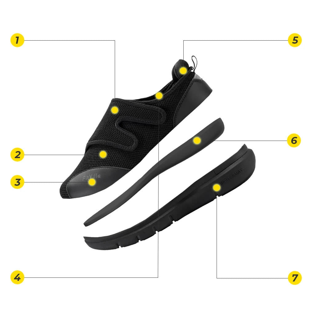 Treten Sie ein in den ultimativen Komfort mit FitVille EasyTop® Diabetikerschuhen V1 – die perfekte Lösung für geschwollene, empfindliche Füße. Mit einer extra breiten Zehenbox und einem hohen Spann bieten diese Schuhe Ihren Füßen den Platz und die Unterstützung, die sie verdienen.