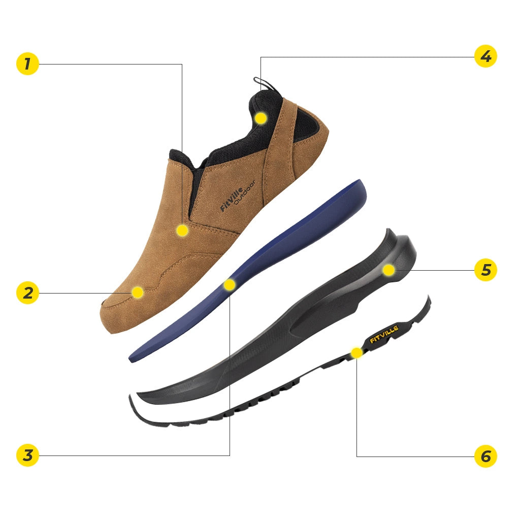 Outdoor-Enthusiasten aufgepasst! Freuen Sie sich auf unsere Explorer Outdoor Slip-On Schuhe V1 für Herren, die ultimative Kombination aus Komfort, Halt und Haltbarkeit für Ihre Abenteuer. Diese Schuhe sind aus Kunstleder und Mesh gefertigt und bieten Atmungsaktivität, umweltfreundliche Haltbarkeit und eine eng anliegende, nicht verformende Passform. Das niedrig geschnittene, einstufige Design und das dicke Schwammfutter sorgen für einfaches An- und Ausziehen und unübertroffene Stabilität. Im Inneren genießen Sie seidenweichen Komfort und Schutz mit einer geräumigen Zehenbox. Die umweltfreundliche Einlegesohle bietet soliden Halt, Rückprall und Atmungsaktivität, während unsere Zwei-in-Eins-Außensohle RB für Grip und EVA für Dämpfung und Unterstützung des Fußgewölbes kombiniert. Ob beim Wandern, Campen oder Erkunden, schlüpfen Sie in die Explorer Outdoor Slip-Ons für selbstbewusste, stilvolle Abenteuer.