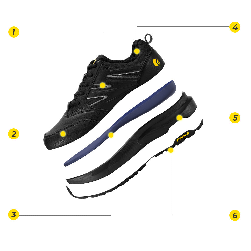 Dank der ErgoFit™-Technologie sind die FitVille-Schuhe ergonomisch geformt und bieten Ihnen ein fantastisches Tragegefühl. Die federnde Dämpfung minimiert den Druck und maximiert die Stabilität.