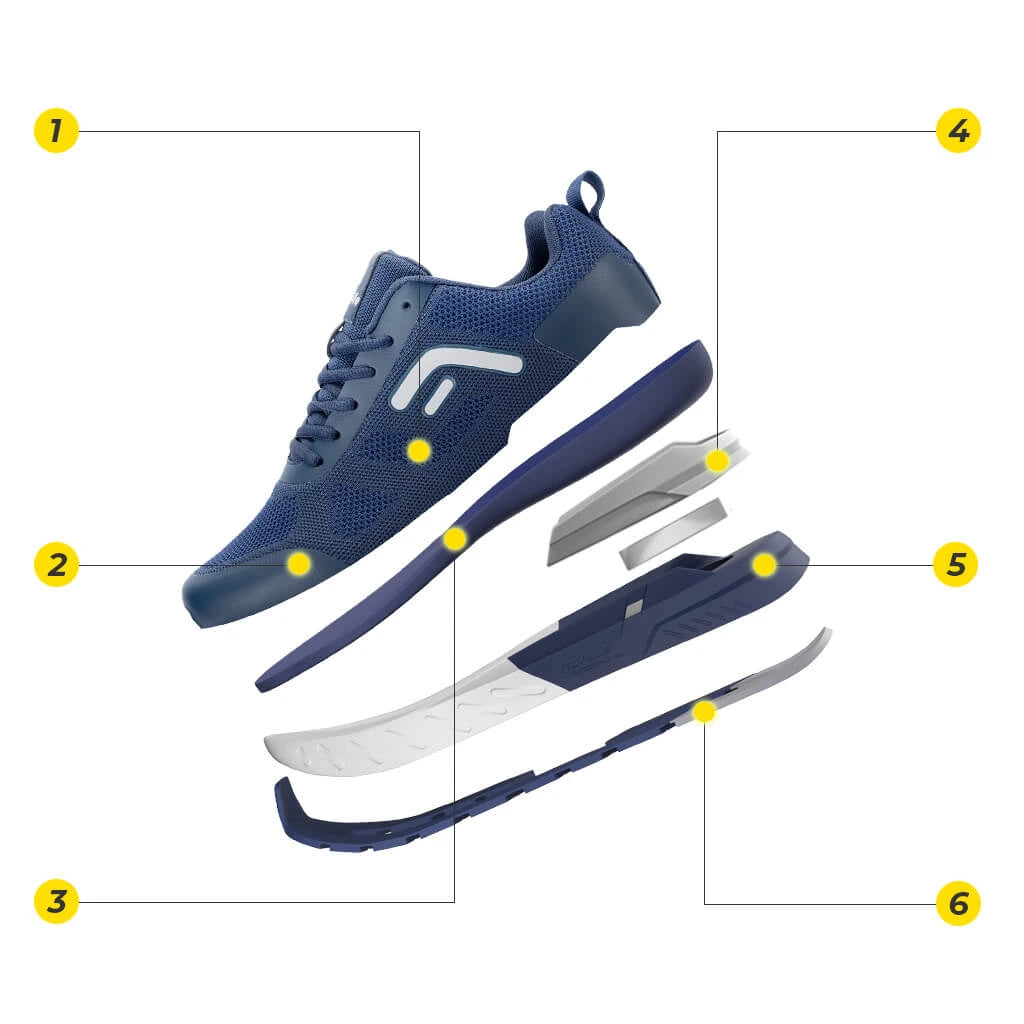 Unsere patentierte PropelCore™-Technologie ist eine dynamische Gesamtheit von fünf Hauptkomponenten: Sohle mit doppelter Dichte, rutschfester Gummi, Fersenring, herausnehmbare Einlagen, stoßdämpfendes Polster. PropelCore™ ist unsere Geheimwaffe bei der Entwicklung der unterstützendsten Schuhe.