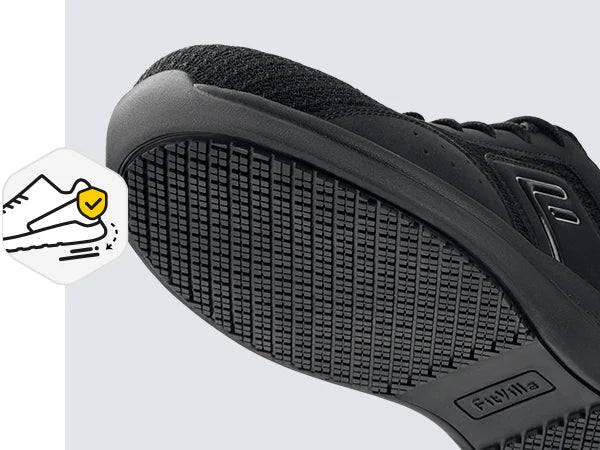 The patterned rubber outsole offers a solid grip on low traction surfaces and remains stable facing oil and water. Ideally made for warehouse and kitchen jobs.